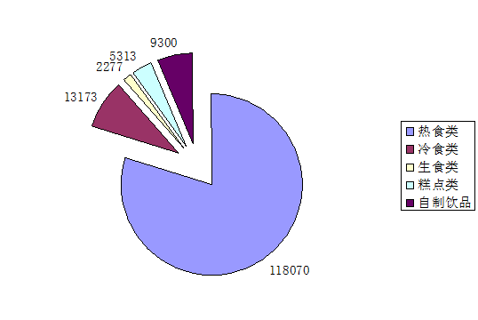 按食品种类划分,热食类食品制品118070家,冷食类食品制品13173家,生食类食品制品2277家,糕点类食品制品5313家,自制饮品销售9300家。
