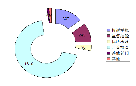 从案件来源看,投诉举报337件,监督抽验245件,执法检验76件,日常监管和专项检查1610件,其他部门通报23件,其他30件。