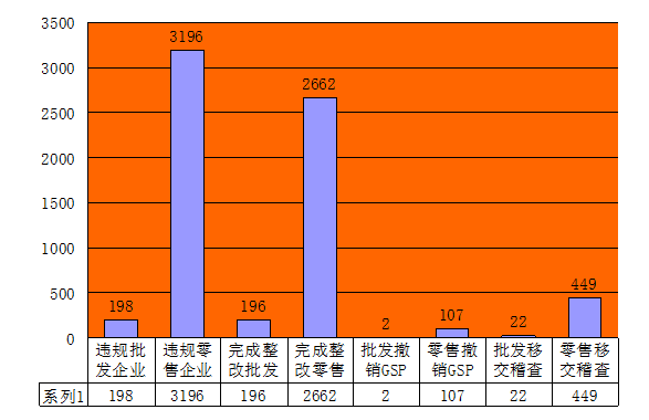 2017年一季度,全省共检查药品经营批发企业1347家次,零售企业25778家次。存在违法违规的批发企业198家次,零售企业3196批次。完成整改的批发经营企业196家次,完成整改的零售企业2662家次。批发企业撤销GSP证书2张,零售企业撤销GSP证书107张。批发企业移交稽查部门立案查处22件,零售企业移交稽查部门立案查处449件。