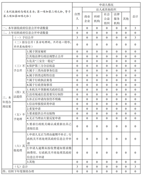 三、收到和处理AG真人申请情况 四、AG真人行政复议、行政诉讼情况 五、存在的主要问题及改进情况 2022年,AG真人政务公开工作有力有序推进,但仍存在一些薄弱环节。一是思想认识还有待提高,存在主动公开不及时的现象。二是栏目更新还有待加强,紧盯时政动态、重点工作设置新栏目还不够。三是方式方法还有待完善,在宣传报道、政策解读等方面多以文字、图片为主,内容和形式仍需进一步丰富。 下一步,我局将加大政务公开力度,定期对内容是否及时更新、信息是否准确、要素是否齐全等情况开展自查,做到安全规范高质量运行。加强AG真人平台建设,丰富公开渠道,提升服务水平,及时准确传递药品监管信息,保障人民群众知情权。 六、其他需要报告的事项 2022年,我局在办理依申请公开工作中,未向申请人收取任何费用。 |